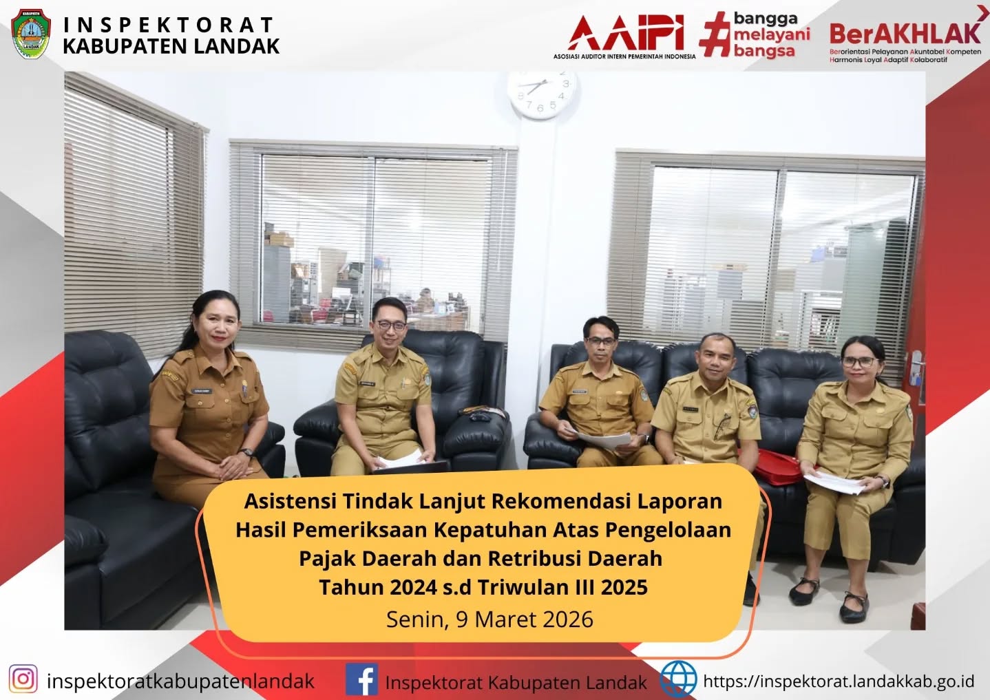 Asistensi Tindak Lanjut Rekomendasi Laporan Hasil Pemeriksaan Kepatuhan Atas Pengelolaan Pajak Daerah dan Retribusi Daerah Tahun 2024 s.d Triwulan III Tahun 2025. Senin, 9 Maret 2026