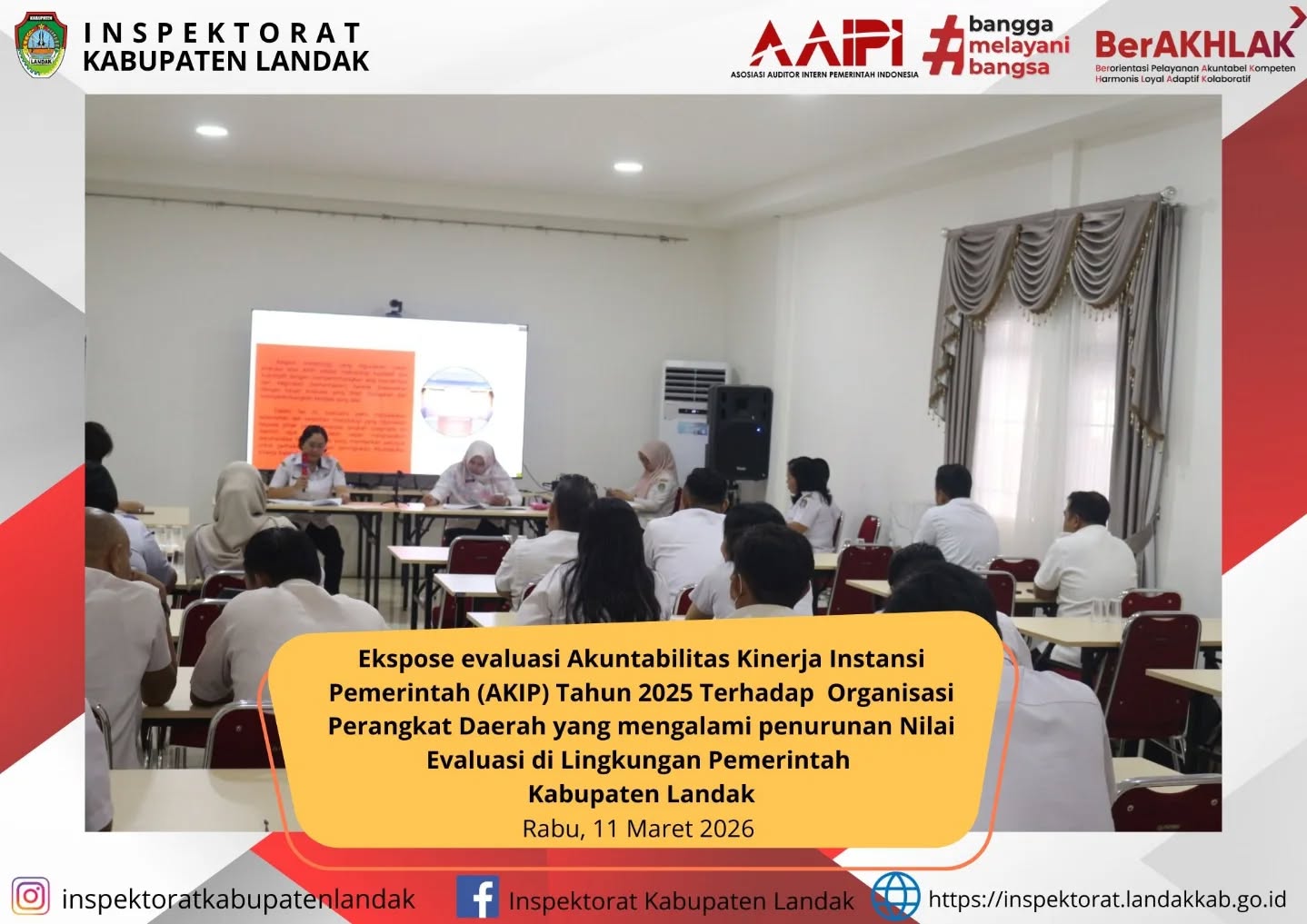 Ekspose evaluasi Akuntabilitas Kinerja Instansi Pemerintah (AKIP) Tahun 2025 Terhadap Organisasi Perangkat Daerah yang mengalami penurunan Nilai Evaluasi,di Lingkungan Pemerintah Kabupaten Landak. Rabu 11 Maret 2026