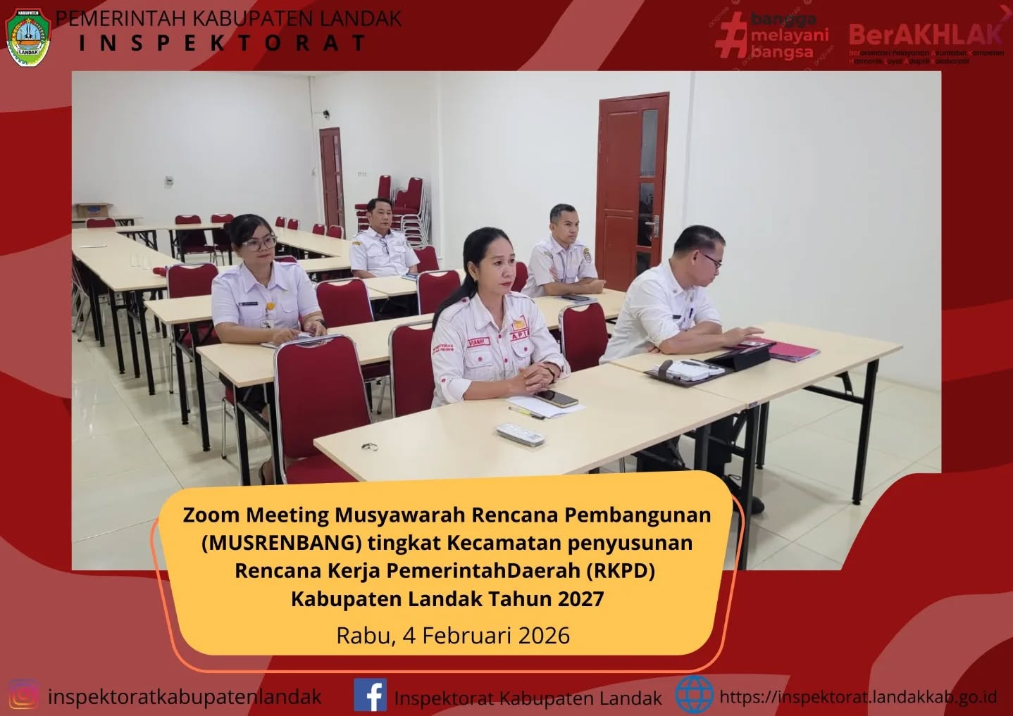 Zoom Meeting Musyawarah Rencana Pembangunan (MUSRENBANG) tingkat Kecamatan penyusunan Rencana Kerja Pemerintah Daerah (RKPD) Kabupaten Landak Tahun 2027. Kegiatan dihadiri oleh Plt Inspektur, Plt. Sekretaris, Para Irban dan JF. Perencana/Pejabat/Staf yang membidangi Perencanaan di Inspektorat. Untuk kelancaran kegiatan tersebut disampaikan beberapa hal sebagai berikut: 1. Camat beserta peserta musrenbang dari tingkat kecamatan mengikuti kegiatan secara terpusat di wilayah kecamatan masing-masing; 2. Anggota DPRD dan OPD mengikuti secara daring dari tempat kerja masing masing; 3. Teknis Pelaksanaan kegiatan dikoordinasikan oleh Bappeda Kabupaten Landak.